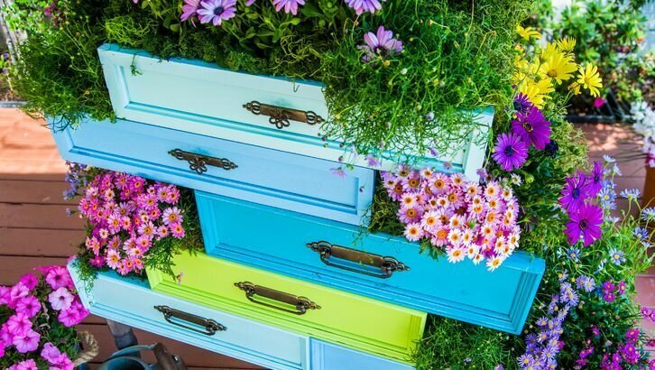 Для того, чтобы украсить дачный участок цветочками, можно сделать необычные клумбы. Их можно сделать из чего угодно: из старой мебели или даже обуви) А можно высадить растения в ящиках стола)