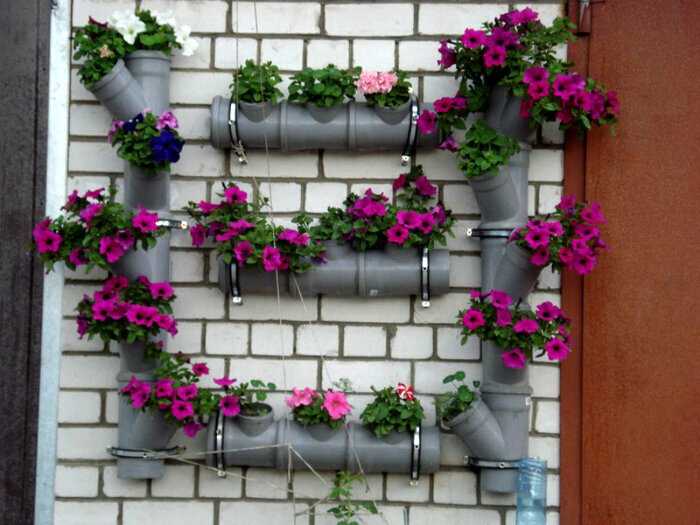 Необычные цветники можно также сделать из остатков пластиковых труб (канализационных или водосточных). Достаточно просто подвесить и закрепить, и можно высаживать растения.