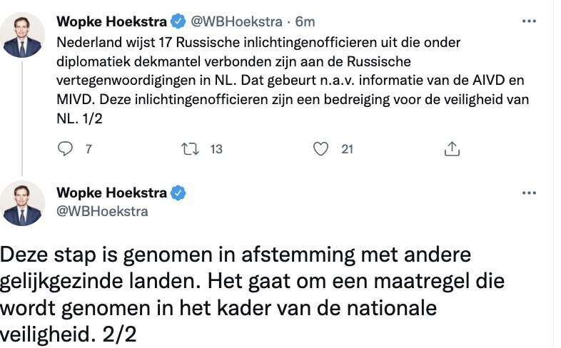 Нидерланды высылают 17 российских дипломатов — власти страны заявили, что это сотрудники разведки, которые работали под прикрытием. Их обвинили в создании угрозы для безопасности.
