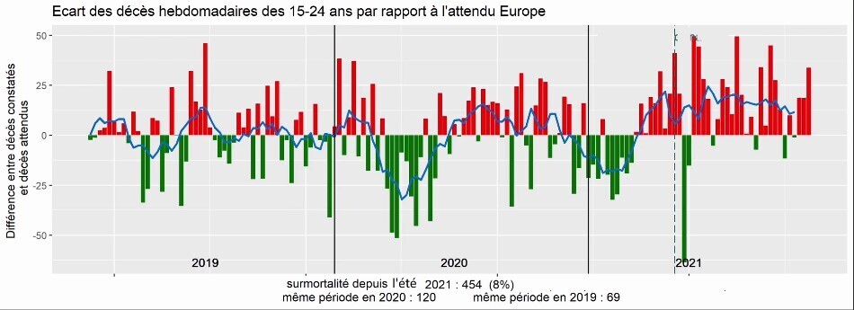 В Европе в 2019 г умерло 69 подростков от разных болезней, в 2020 г. умерло 120 молодых людей в возрасте от 15 до 24 лет, а после начала вакцинации 454.