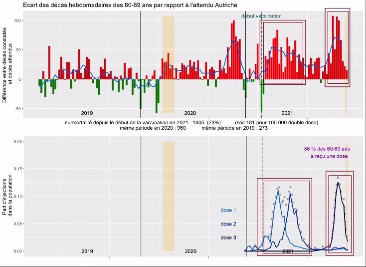 Самые наглядные данные в Австрии, но уже в возрастной группе 60-69 лет. За 2020 год, умерло 960 человек, а за 2021 год 1605 человек