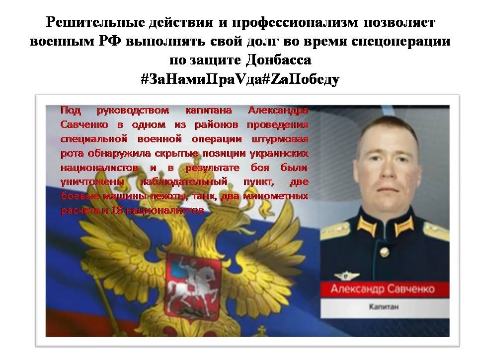 Под руководством капитана Александра Савченко в одном из районов проведения специальной военной операции штурмовая рота обнаружила скрытые позиции украинских националистов и в результате боя были уничтожены наблюдательный пункт, две боевые машины пехоты, танк, два минометных расчета и 18 националистов