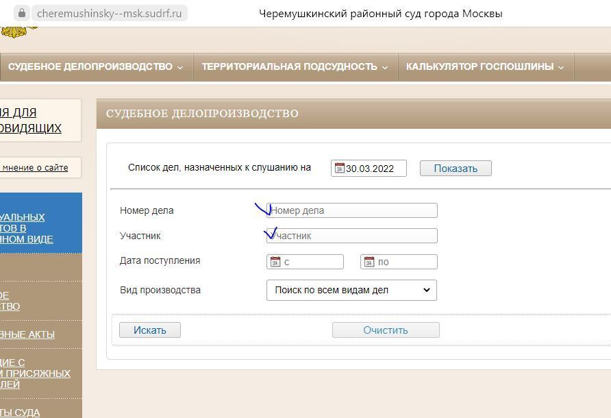 Найти официальный сайт суда легко: необходимо просто в поисковике набрать полное название суда, например, Черемушкинский районный суд города Москвы.