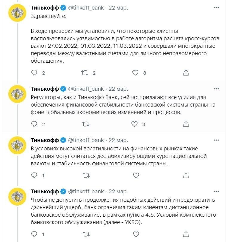 «Тинькофф» списал миллионы рублей у клиентов, которые играли на курсах валют. Их заподозрили в «дестабилизации финансовой системы страны».