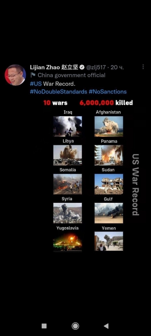 📝Официальный представитель МИД КНР в Твиттере «10 войн США, 6 миллионов убитых — санкций нет»