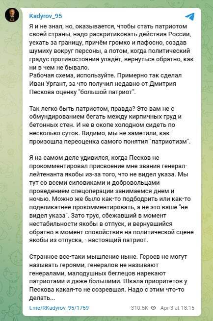 Я на самом деле удивился, когда Песков не прокомментировал присвоение мне звания генерал-лейтенанта якобы из-за того, что не видел указа. Мы тут со всеми силовиками и добровольцами проведением спецоперации занимаемся днем и ночью. Можно же было как-то подбодрить или как-то поделикатнее прокомментировать, а не это ваше "не видел указа". Зато трус, сбежавший в момент нестабильности якобы в отпуск, и вернувшийся обратно в момент спокойствия на политической сцене якобы из отпуска, - настоящий патриот",-высказал мнение Рамзан Кадыров.