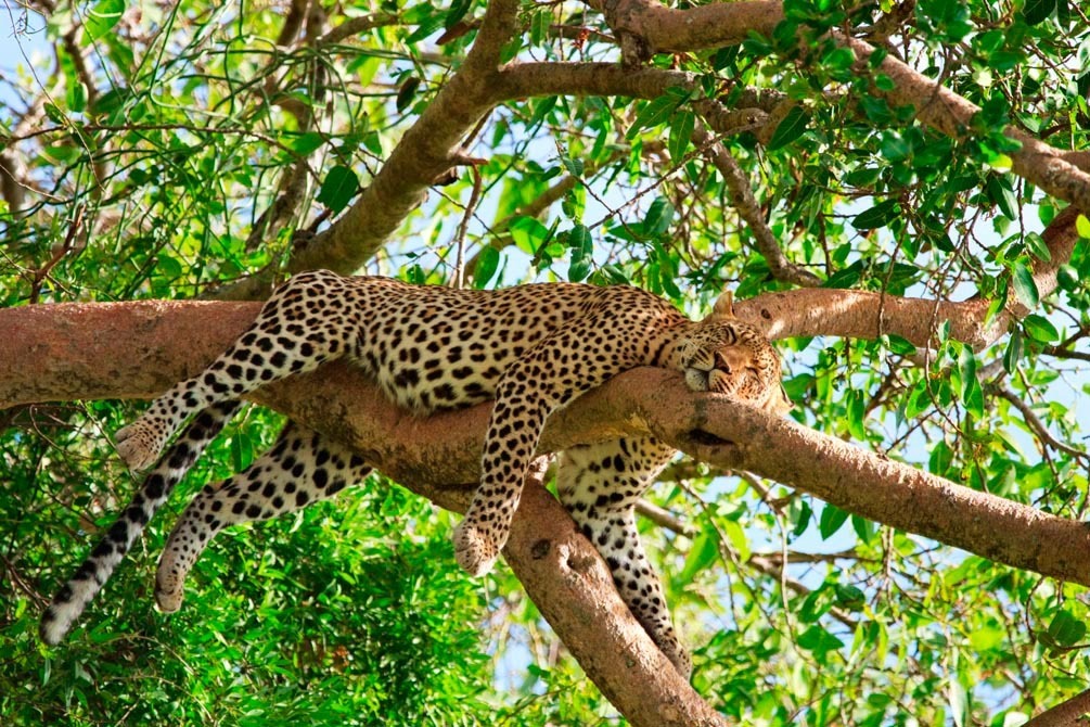 Благодаря своей ловкости леопард может охотиться сидя на дереве, поймав свою добычу на лету. Также он питается и мелкими буйволами, козами, оленями и тропическими бородавочниками. Леопард благодаря своим особенностям зрения охотится как днем, так и ночью, в отличие от других сородичей своего вида.