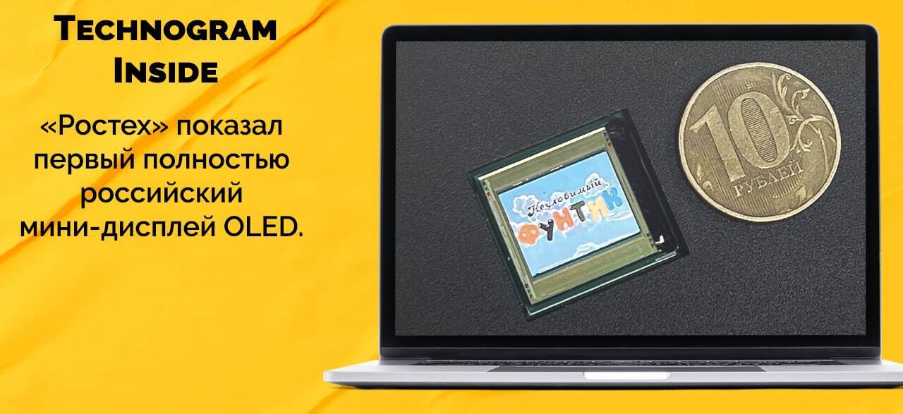 Холдинг «Росэлектроника», входящий в состав госкорпорации Ростех, показал микродисплей OLED полностью российского производства. Разрешение устройства размером с десятирублевую монету составляет 1280 х 1024 пикселя с шагом пикселей 12 мкм. Такие экраны можно использовать в очках виртуальной реальности, фото- и видеокамерах, тепловизорах.