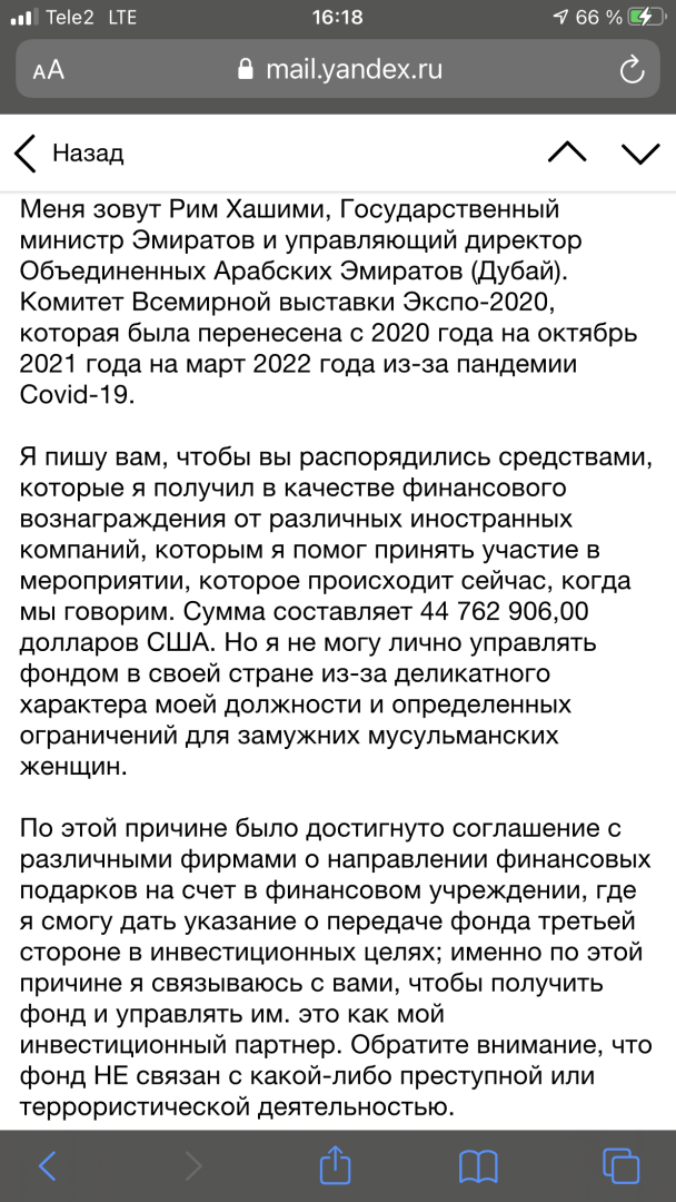 Недавно получала письмо от якобы гос представителя Саудовской Аравии о якобы предложении получать финансы и их преумножать, потому что мусульманские женщины не имеют право на финансы, жесть, конечно письмо без ответа, тк такое пишут аферисты! Откуда у саудовской аравии моя почта и с чего он, решил предложить мне его деньги?)