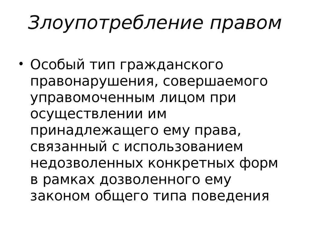 Действующее законодательство Российской Федерации закрепляет один интересный вид вроде бы законного поведения субьектов правоотношений, однако в итоге приводящего к причинению материального или морального вреда другим участникам общественных отношений. В частности, такой вид поведения закреплен в статье 10 Гражданского кодекса РФ.