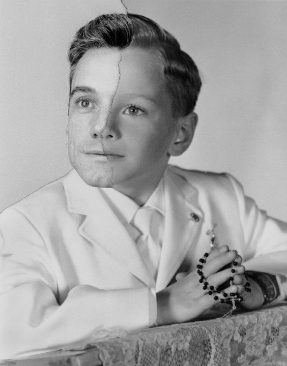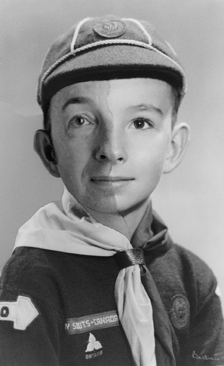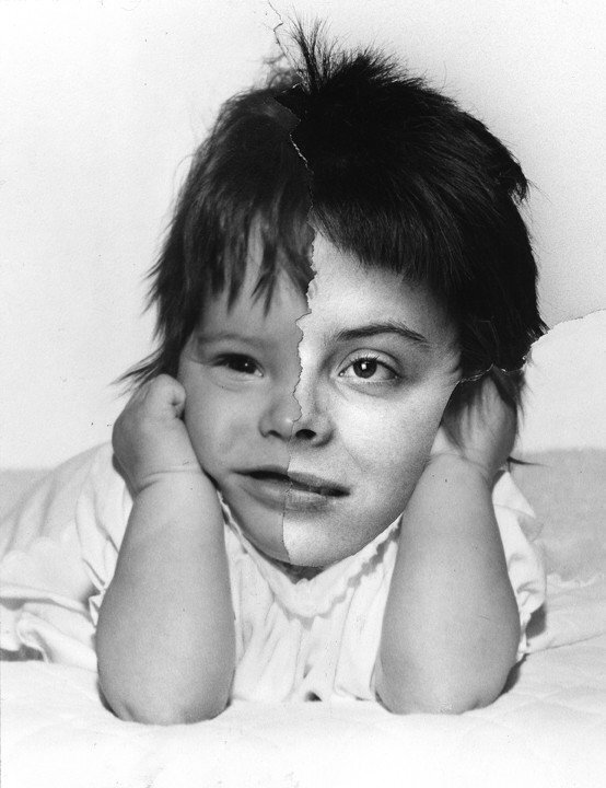 Только представьте, сколько надо было работать, чтобы создать один портрет «было/стало»! Автор брал старую фотографию, делал современный снимок человека в аналогичном ракурсе. Новое фото разрывал пополам и накладывал на его давнюю версию.