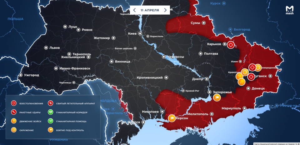 Телеграм-канал Mash создал актуальную интерактивную карту военной операции России на Украине. На карте отмечены территории, контролируемые войсками РФ и ЛДНР, зоны боев, движение войск и гуманитарные коридоры.