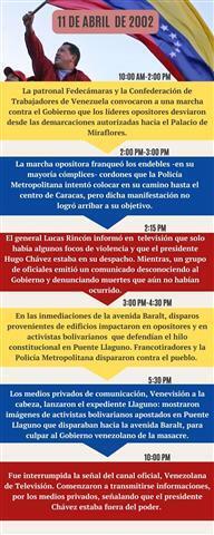 «За несколько дней до 11 апреля венесуэльские правые уже имели ряд волнений, ограниченных только востоком от города, в те дни они выходили на улицы и искали способы нарушить общественное спокойствие», — говорит он Пренсе. Латина Луис Мануэль Флорес, один из участников тех исторических дней.