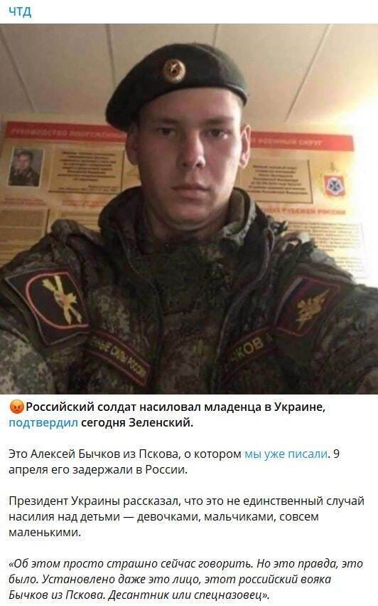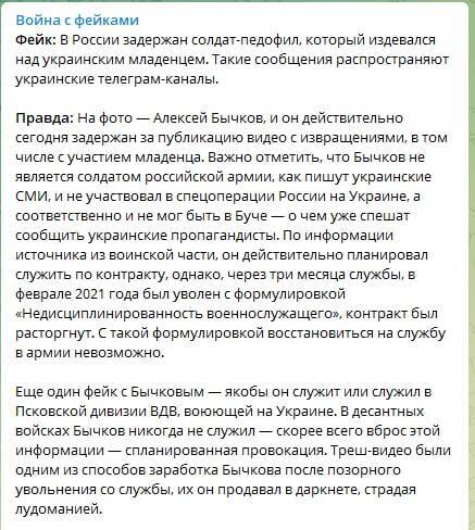 Правда: Алексей Бычков, которого упомянул Зеленский, не является действующим военнослужащим ВС РФ и не мог участвовать в событиях на Украине. Он действительно был задержан за публикацию видео с извращениями, в том числе с участием младенца. Треш-видео были одним из способов его заработка после позорного увольнения со службы в феврале 2021 года. Мы подробно разбирали его историю и в отдельном материале – фейки об изнасилованиях. Украинские источники регулярно выдают информацию о новых фактах сексуального насилия. В этот раз прямое обвинение в адрес российских военных прозвучало из уст президента страны. Доказательств в подкрепление своих слов Зеленский не привел – предполагается, что ему обязаны верить на слово. Не все европейские страны готовы верить украинским спикерам. Венгрия запросила у Украины доказательства того, что события в Буче - не постановка, но не получила их.
