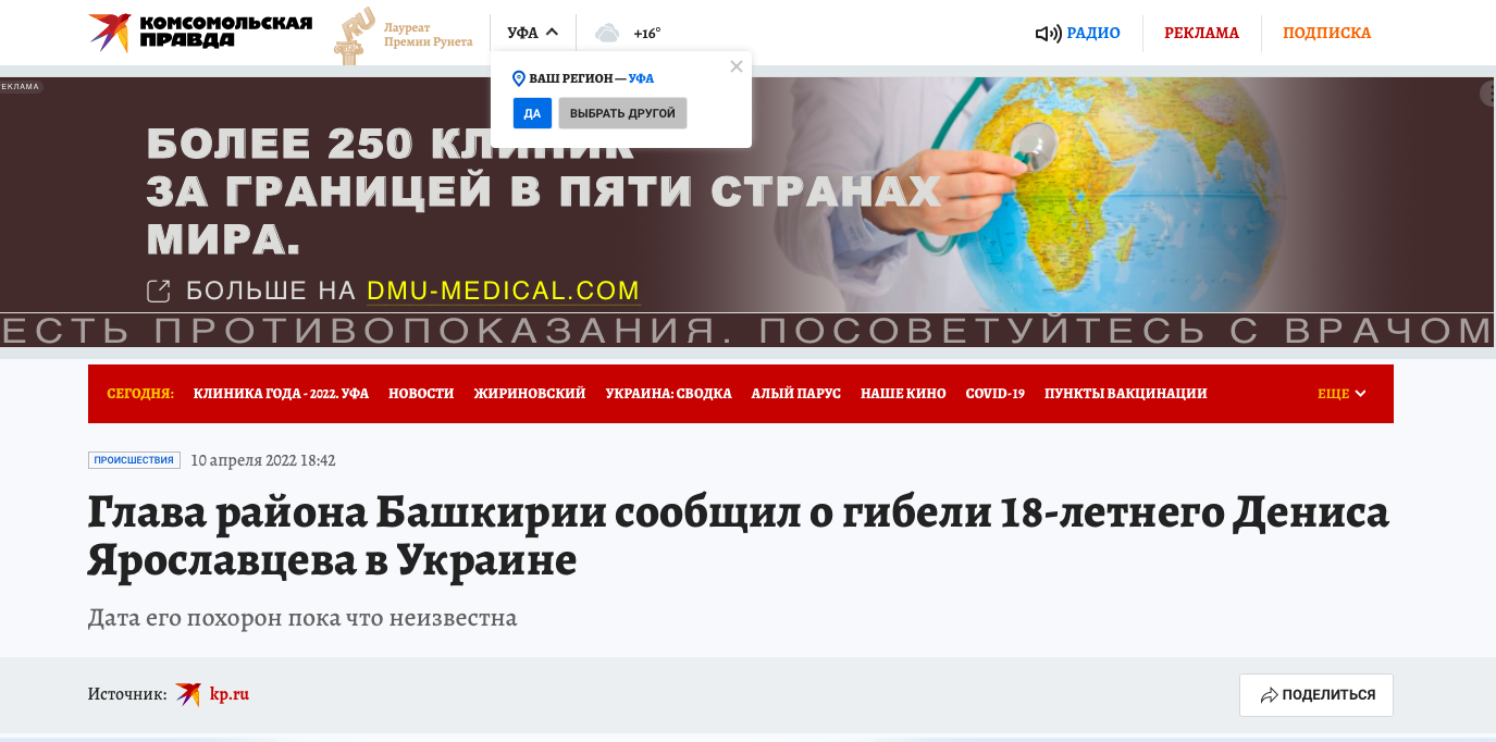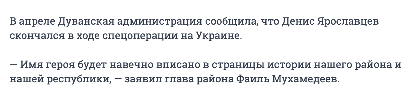 Глава Дуванского района Башкирии Фаиль Мухамедеев сообщил трагическую новость: на Украине погиб 18-летний контрактник (?) Денис Ярославцев из села Ярославка Дуванского района Башкирии, 25.10.2003 года рождения (срочников не отправляют на СВО, только контрактников).