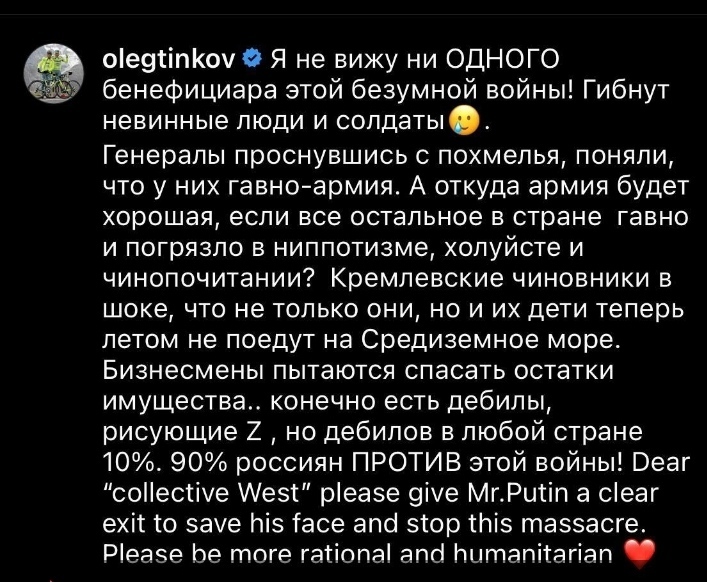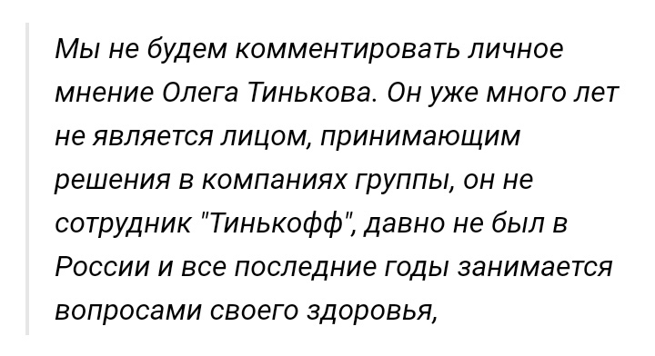 Я сам до конца неоднозначно отношусь к спецоперации, но оскорблять людей за определённую позицию, это мне кажется верх дебилизма. Да ещё так лебезить перед западом. Что это предательство, подхалимство, или Родина там где деньги? А может он сам был с похмелья, а не генералы и потому всё это написал? Мне кажется такое недопустимо. Кстати "Тинькофф банк" фактически отрекся от своего учредителя, заявив что это не позиция банка, а личное его мнение.