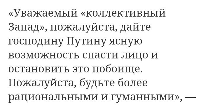 Интересна позиция тем, что соотечественников он назвал дебилами, а "коллективный Запад" многоуважаемым. Вот перевод его текста: