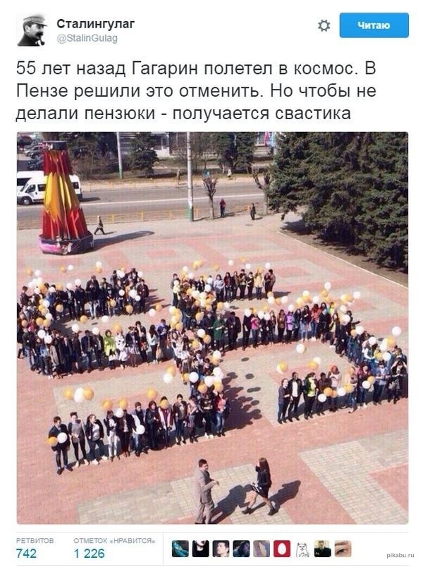 Меня удивляет, насколько глупыми и ограниченными могут быть люди. Ну проверяйте вы информацию, у вас под руками интернет, он знает все! Это Пенза, 2016 год и детишки отмечают День космонавтики, а не 55 дней спецоперации. Загуглите "Участники флешмоба в честь Дня космонавтики случайно выстроились свастикой" и проверьте. А вы уже тут все на г... от злости изошли над чьим-то фейком. Ну самим-то не стыдно? Или в Пензу тоже хотите бомбу кинуть?!