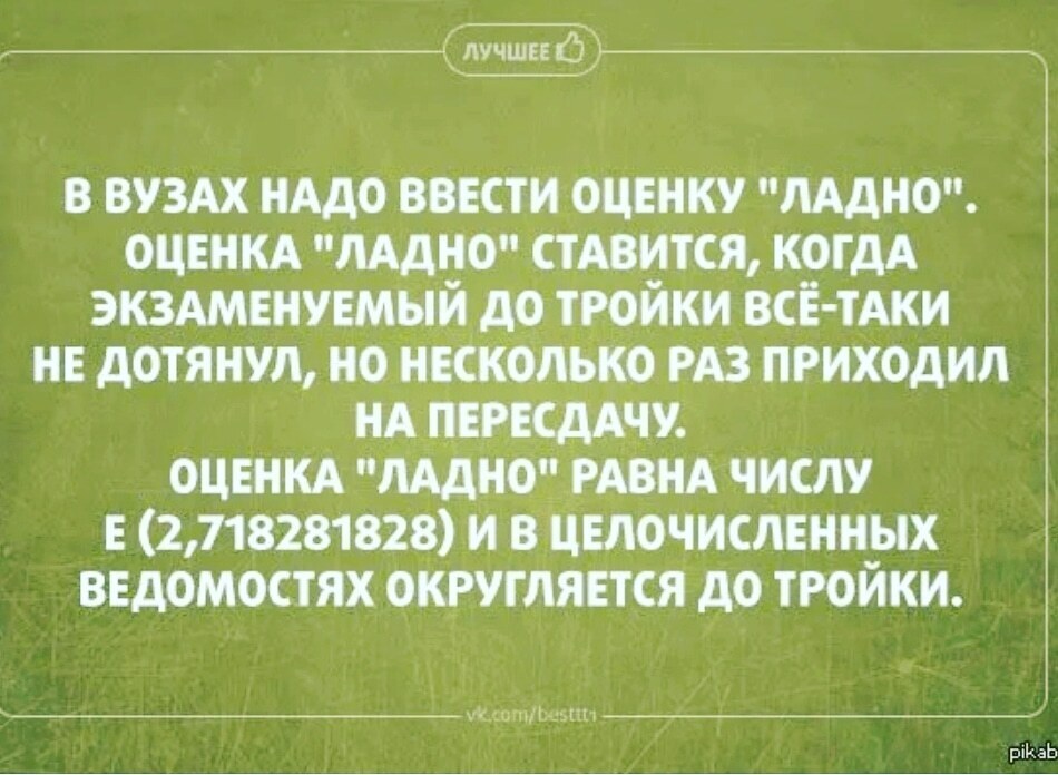 Оценка ну ладно, интересное "ноу хау "в нашем образовании😂вспоминаешь этих бедных студентов, когда они реально ходят на пересдачу по 5 раз с глазами "ну поставьте мне уже хоть троечку" 😂