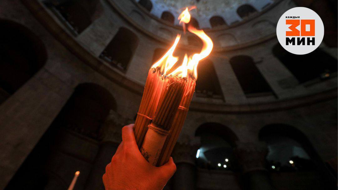 Благодатный огонь прибыл в Москву. В храме Христа Спасителя началась пасхальная служба.