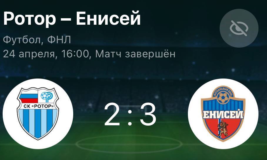 Завершился футбольный матч Ротор-Енисей со счётом 2/3 в пользу Енисея