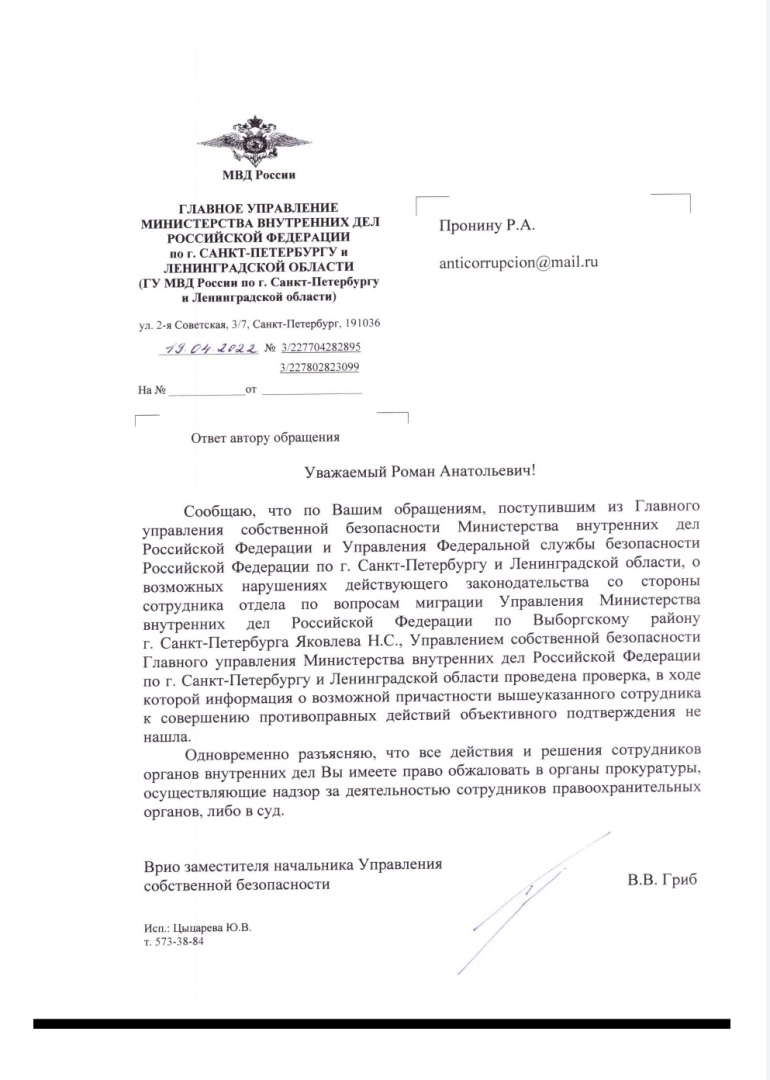 ⚡🛑Информация о возможных нарушениях требований действующего законодательства со стороны сотрудника отдела по вопросам миграции УМВД России по Выборгскому району г.Санкт-петербурга Яковлева Н.С. - не нашла своего подтверждения🛑⚡