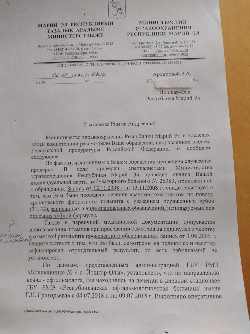 Вот фото письма - ответ Минздрава на мою просьбу расшифровать коды диагнозов. Поразительно, на карточке написано "Дз 31" - диагноз , а врач с высшим образование пишет что это мои 31 и 32 зубы лечили. Да к тому и без моего присутствия осмотрели мой образ и не обнаружили чесотки, о чем и штампик поставили.