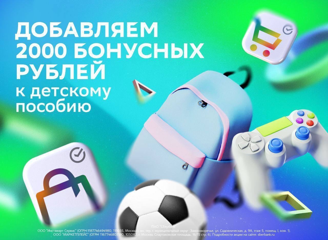 После первого начисления пособия вам на карту поступят бонусные баллы: 1000 баллов на покупки в СберМаркете и 1000 баллов на покупки в СберМегаМаркете.