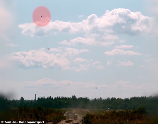 На снимке: В демонстрационном ролике показана противотанковая мина российского производства ПТКМ-1Р. Мина сначала поднимается в воздух над целью, а затем атакует менее защищенную башню танка.