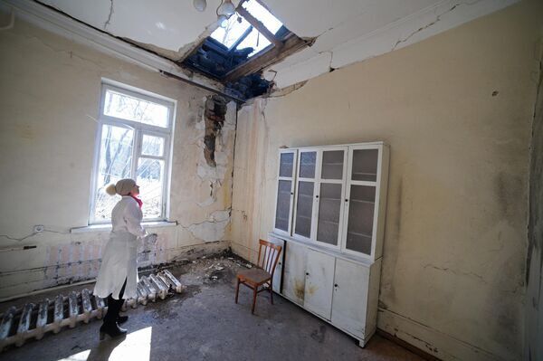 На фото: сотрудник осматривает повреждения Донецкой городской больницы № 20.