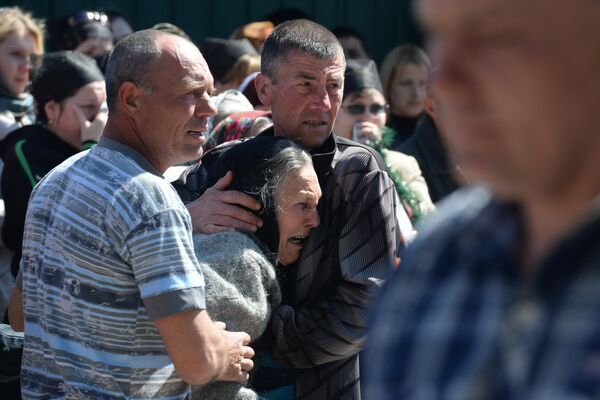 На фото: жители Донецкой области на панихиде по 21-летнему милиционеру Александру Лубенцу, погибшему 24 апреля при обстреле блокпоста украинскими военными.