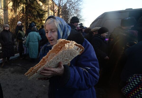На фото: пожилой житель Дебальцево получает хлеб от народного ополчения Донбасса, февраль 2015 года.