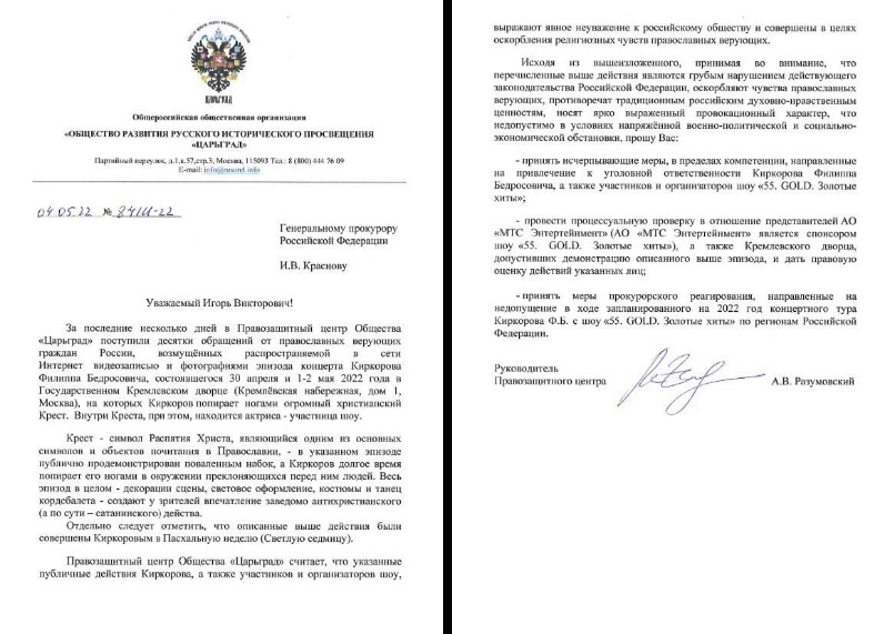 На этот раз, общество «Царьград» обратилось к Генеральному прокурору России с просьбой проверить действия артиста во время концерта, где он попирает ногами христианский крест, который по своей сути является символом Распятия Христа и почитается в Православии.
