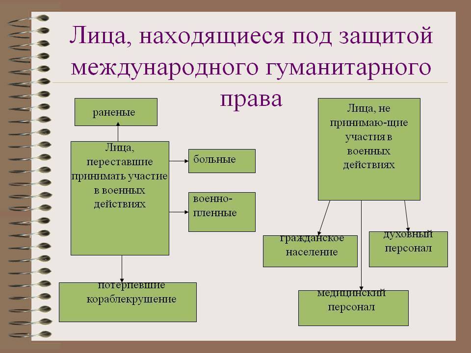 Под защитой международного гуманитарного права находятся раненые и больные военнослужащие, военнопленные, военнослужащие ВМФ, потерпевшие кораблекрушение, мирные жители, служители церкви, все медицинские работники (являются военнослужащими априори).