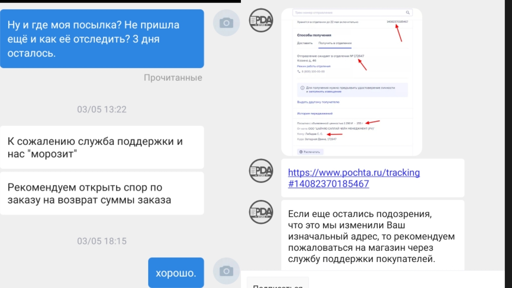 Проходит ещё какое-то время, отследить посылку нельзя, пишут, что она находится в месте получения, то есть в Западной Двине. Срок защиты кончается, и приложение мне советует связаться с продавцом. Я понимаю, что моя вина тоже есть, раз не проверил адрес. Но пишу продавцу: где моя посылка? Продавец сам советует открыть спор. Что я и делаю.