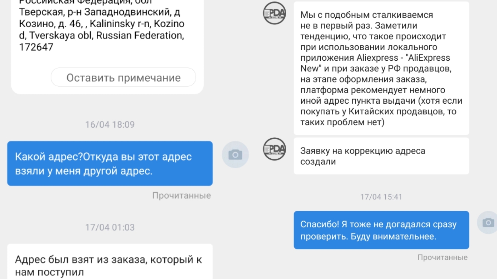 Но через день-два меня что-то смутило, зашëл в приложение и написал продавцу, откуда они взяли данный адрес. Конечно, проверил в приложении у меня нужный адрес. Он отвечает: мол, такой адрес нам поступил. Если нужна корректировка, пишите адрес.... я написал. Он ответил, что заявка оформлена и адрес поменяли.