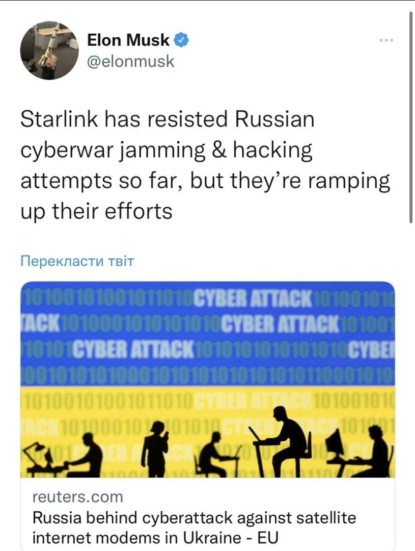 ❗️Илон Маск сообщает о российских хакерских атаках на спутниковый интернет в Украине