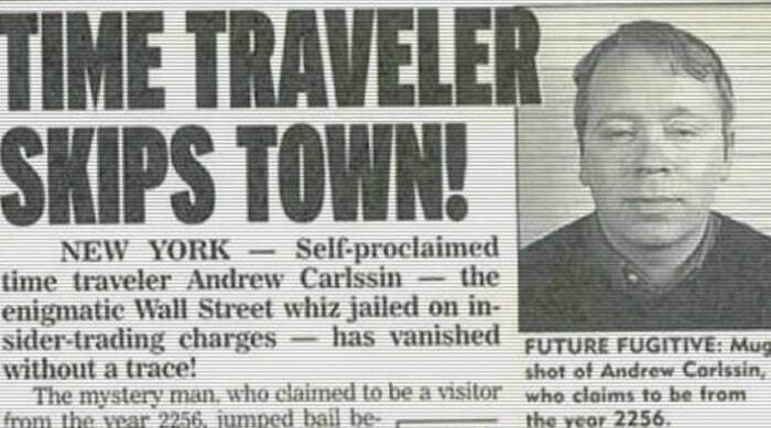 После ареста, когда у него потребовали выдать сообщников, он признался, что информацию получил из будущего. По его словам, он прибыл на машине времени из 2256 года, однако ее местонахождение указать не пожелал. Спустя какое-то время некто внес за него залог в $ 1 млн, и Э. Карлсин исчез.