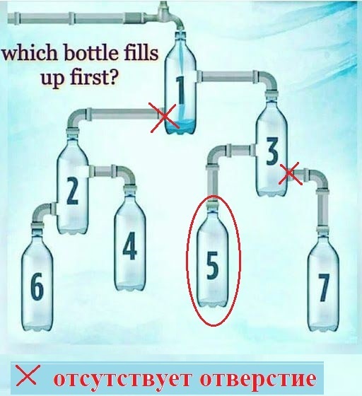Нет ссылки... Я ответил верно. Наполнятся три бутылки: сначала пятая, потом третья и последней первая. Доступ жидкости к остальным перекрыт...