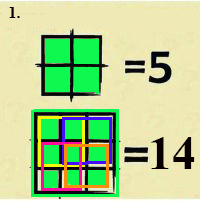 На втором рисунке 9 маленьких, один большой, вместе 10, но есть ещё 4 средних. Таким образом, если сосчитать все квадраты на втором рисунке, получаем 14.