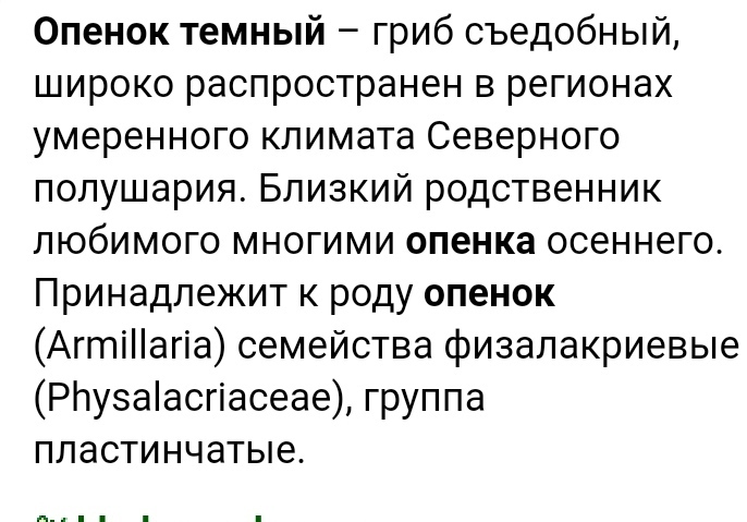 Самый большой гриб, а точнее сказать грибницу темного опёнка была зафиксирована в США в заповеднике штата Орегон, которая по площади составляет почти 1 тысячу гектар и по расчётам учёных весит порядка 600 тонн. Возраст этой грибницы более 25 веков. Темные опята съедобны.