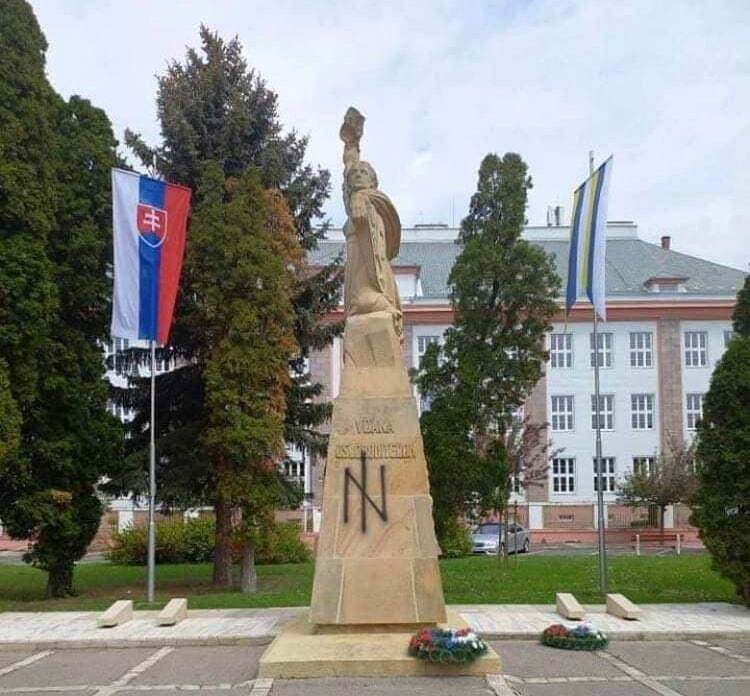 МонументПамятник русским воинам-освободителям опоганили в курортном мегаполисе Пиештяны за западе Словакии. На постаменте нарисовали знак неонацистского полка "Основ" (против его боевиков в РФ возбуждено уголовное дело).