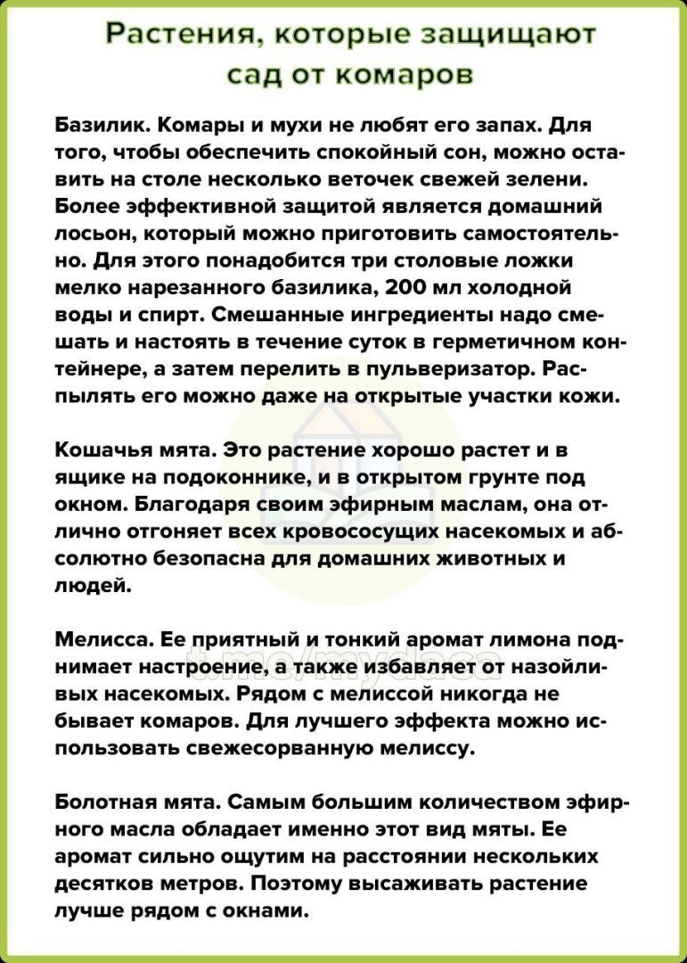 Вот почему у меня в саду так много кошачий мяты, все пытаюсь от нее избавится, в этом году прикладываю все усилия чтоб ее уничтожить. Зато у нас комариков нет))) Душистых трав очень много. Хотя вот когда жила в Сибири, там комаров столько, ни одна трава не поможет. Такое ощущение они ни чего не боятся.