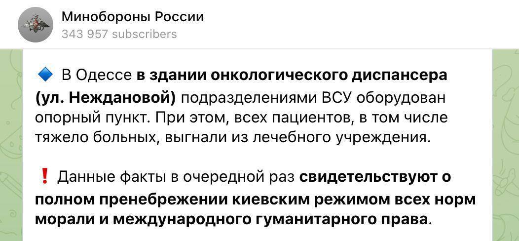 Сегодня из Одессы скинули комментарий по поводу того, что в здании онкологического диспансера ВСУ организовало опорный пункт, а больных выгнали.