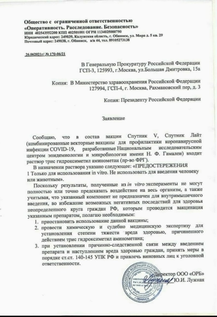 Многих людей интересует состав вакцины, которой так активно кололи людей, так вот, я нашёл одно заявление в прокуратуру, где заявитель пишет о составе серии «Спутник»: