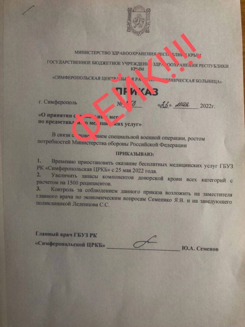⚡️Министерство здравоохранения Республики Крым опровергло информацию о приостановке оказания бесплатных медицинских услуг в связи со спецоперацией и о необходимости создать запас компонентов для переливания крови.
