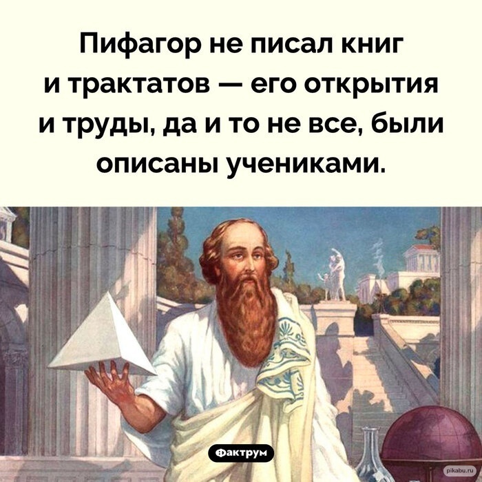 Да)) Пифагор не писал ничего). Собственно он был знаменитым эзотериком. Его пифагорейское общество после распада, по некоторым предположением, стало родоначальником масонства)). Хотя общество было безусловно интересным, хоть и оч сильно отгораживалось от людей. Писали за Пифагора в основном неопифагорейцы, им никак не удавалось достичь того, чего хотели, поэтому верить - фифти-фифти. Пифагоровы штаны взяты у египетских математиков.