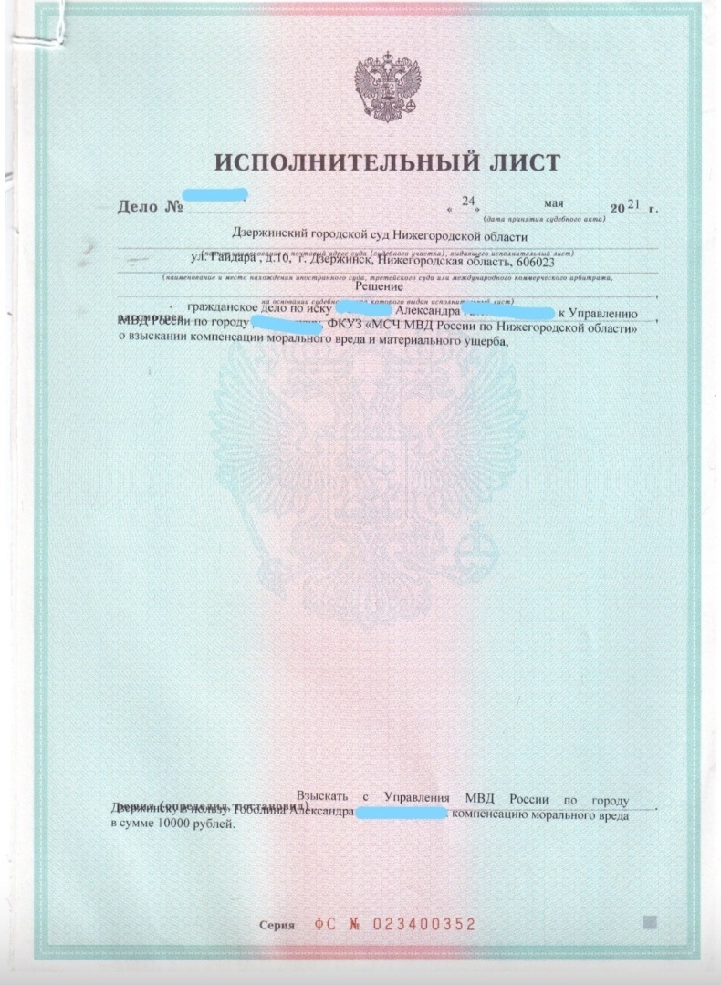 Сегодня приятный момент, получил исполнительный лист после длительной судебной волокиты, что даже пропустил сроки на кассационный порядок для дополнительной практики. Ответчики в лице УВД, МСЧ упорно сопротивлялись, применяя абсурдные доводы, которые суд принимал во внимание. Относительно УВД не получилось, т.к. доводы истца были неопровержимо доказаны.