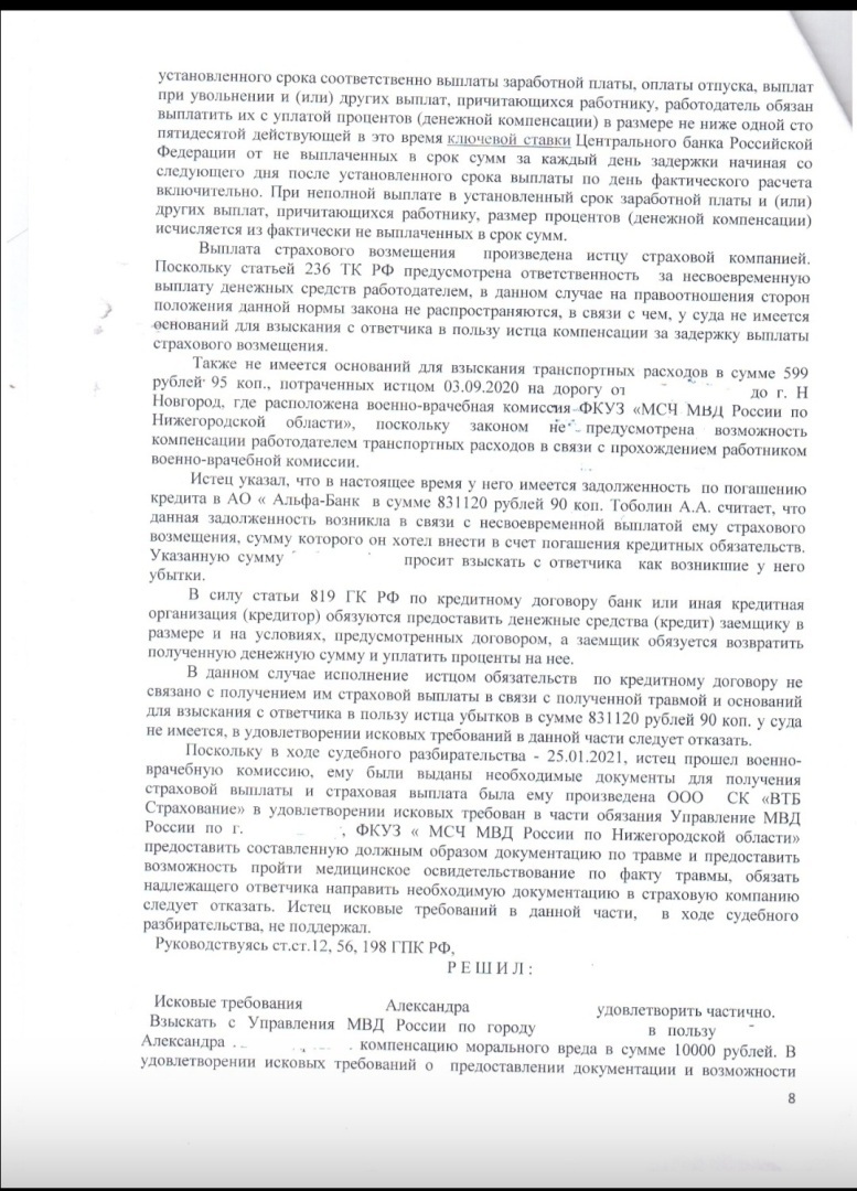 Присутствие сотрудника на ВВК не обязательно, определение степени тяжести травмы проводится по документам, именно данную позицию отстаивал ответчик МСЧ в своих возражениях. Этим самым открыл нам всем менее волокитный путь в получении страховой выплаты.