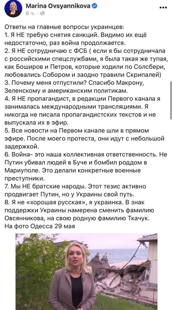 Овсянникова превзошла всех уехавших журналистов вместе взятых и сообщила, что намерена отказаться от собственной фамилии «в знак поддержки Украины». Удивительно, что сам пост написан на русском языке.